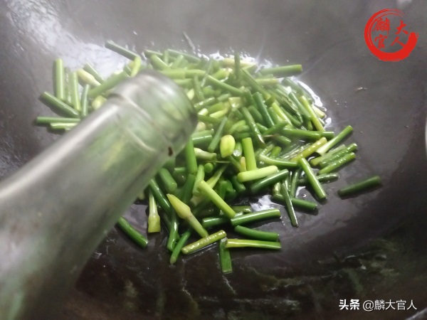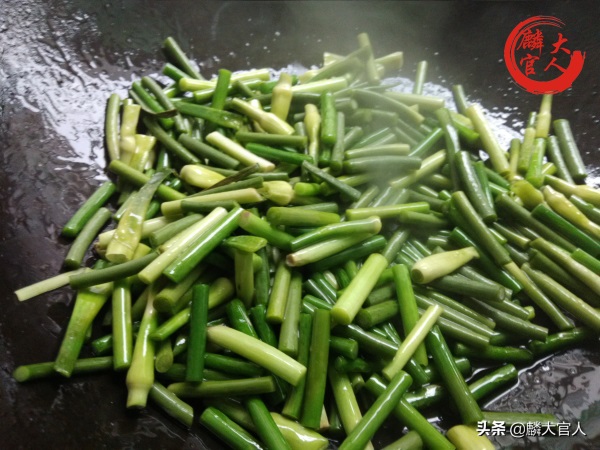 第五步“翻炒蒜苔”:油热后,下入切好的蒜苔段,快速翻炒裹油。
