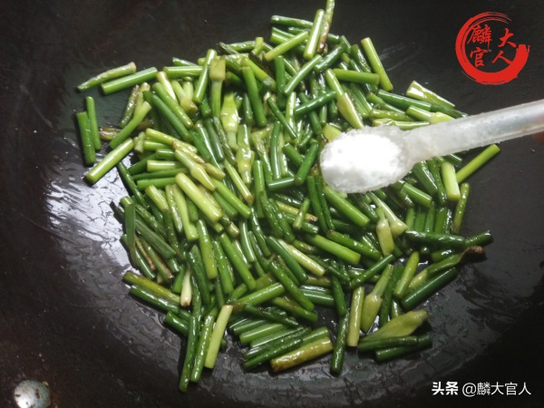 第七步“调味增鲜”:继续翻炒蒜苔2分钟,炒至蒜苔表面皱皮时,加入适量食盐、生抽1勺,快速炒匀给蒜苔调味增鲜。