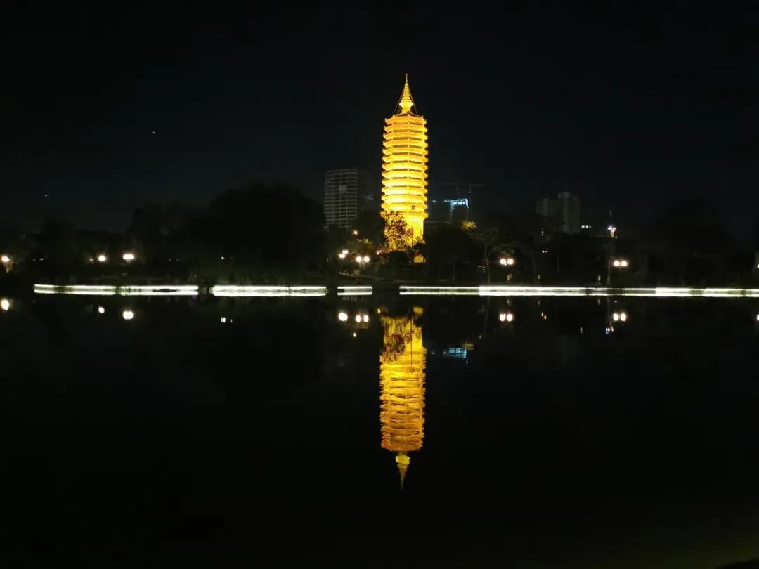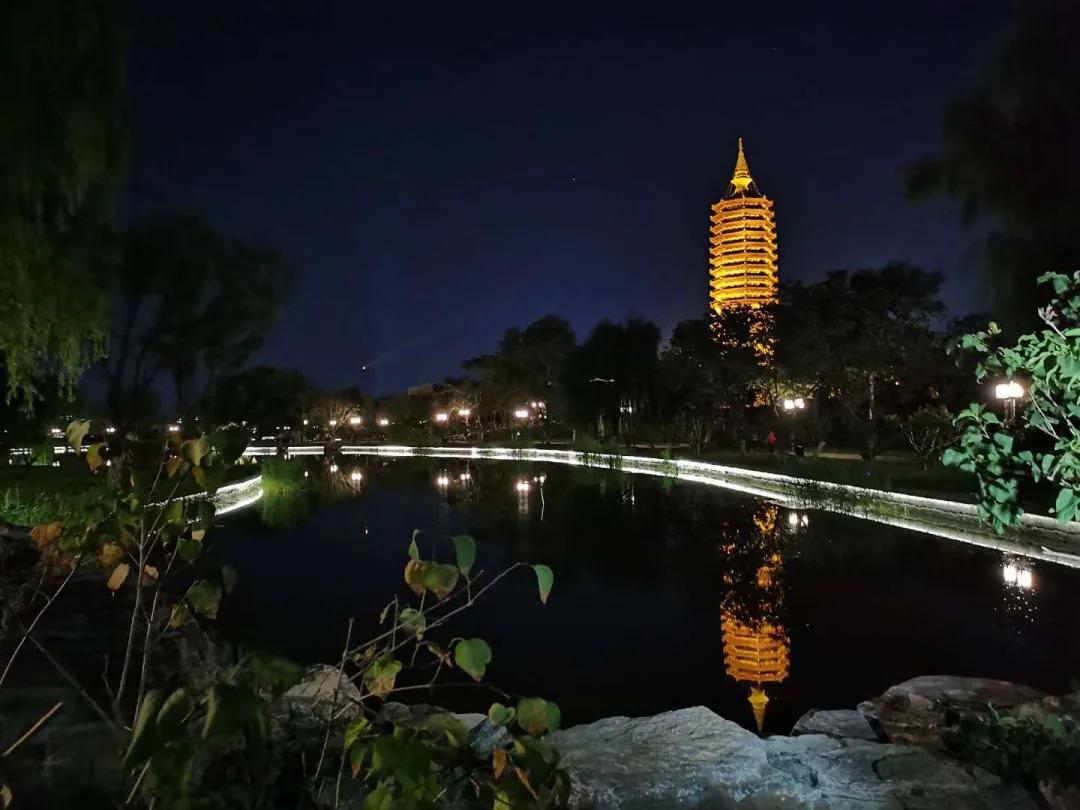 乘着夜色,我们来到西海子公园,整个塔身都被景观灯照亮,层层砖雕斗拱合度精细,面面勾栏浮雕纹饰各别,静心聆听,仿佛还能听到风拂过角铃带起的梵音。塔影倒影在运河里,流光溢彩。“无恙蒲帆新雨后,一枝塔影认通州”,在漕运时代,当千里迢迢北上的客商们,远远的看到这座塔都会激动不已,这意味着他们在经历了无数风浪后,漫长旅途就要到达终点了。