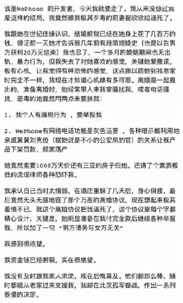 “我从来没想过我是这样的结局,我竟然被我极其歹毒的前妻翟欣欣给逼死了。”