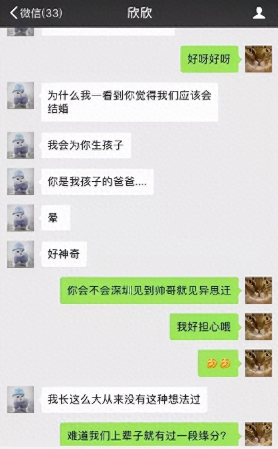 没一会儿,翟欣欣发来消息:“为什么我一看到你就觉得我们应该会结婚?我会为你生孩子,你是我孩子的爸爸……”