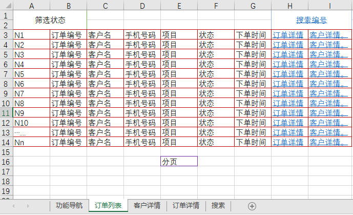 比如下方EXCEL,以订单页面为例。元信息以表格的格子,表示在表格中。同组信息,以相同的边框颜色来区分,进行分门别类。而不同的Sheet就表示不同的信息面。信息面的关联关系,以表格超链接(图中蓝色加下划线的文字)来体现,点击还可以跳转。