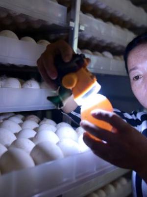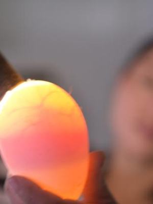 怎么才能了解鹅蛋在孵化过程中的胚胎发育情况?这时候可以通过照蛋器来检查鹅蛋的胚胎发育。(也可以自己合适制作照蛋器,在纸箱开一个圆孔,里面放一个亮度大的大灯泡,然后把鹅蛋放到圆孔上面进行转动检查,圆孔的好处就是防止时间多余的光线照射眼睛影响坯胎检查的准确性)。在整个鹅蛋孵化过程中通常要有两次的照蛋检查来胚胎发育的情况。