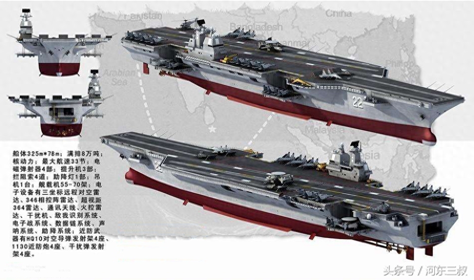 下图是国内军事杂志曝光的002型(001A)最新解析图,全面展示航母配套参数。