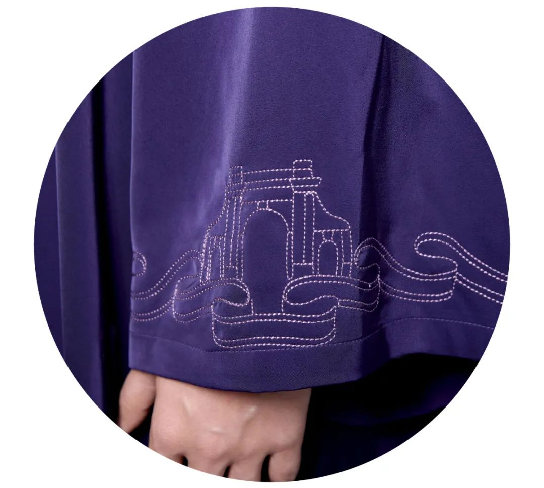 而院长服则是真丝面料搭配紫色垂布,再用中国传统文人的鹤氅做镶边。