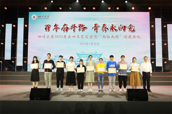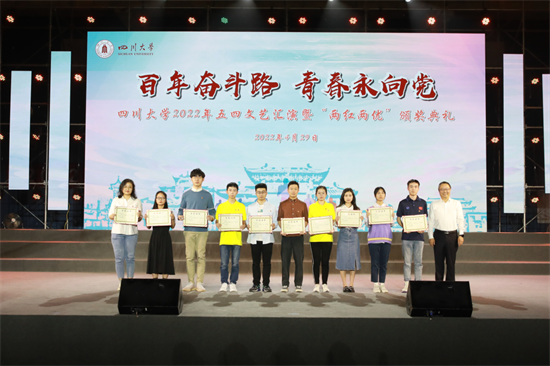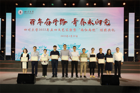 在五四青年节即将来临之际,4月29日晚,“百年奋斗路 青春永向党”四川大学2022年五四文艺汇演暨“两红两优”颁奖典礼在江安校区体育馆举行。校党委常务副书记曹萍,副校长梁斌,校党委副书记郭勇,党政办、宣传部、学工部、保卫处、校工会、校团委、研工部等单位负责同志,各学院党委副书记、团委书记,以及学生代表参加活动。