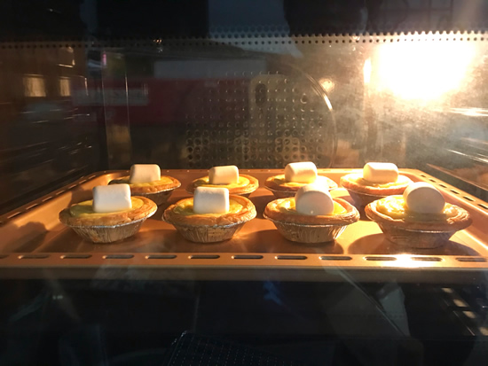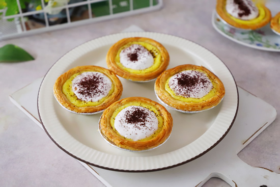 8、烤好的蛋挞表面筛上些可可粉就可以了,酥掉渣的挞皮,香软的挞馅夹着微苦的巧克力,再配上软绵的棉花糖,咬上一口四层口感,真的是太满足了。