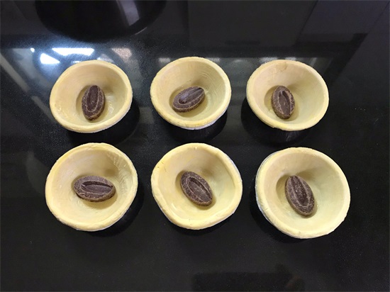 5、蛋挞皮中放入一个巧克力,如果不喜欢巧克力的也可以放上其他的食材,像榴莲,黄桃等水果果肉。