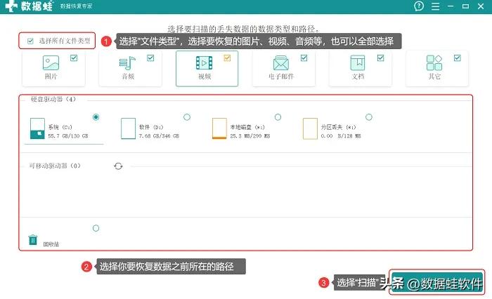 步骤1:打开该软件,选择所有的文件类型,接着选择文件所丢失的磁盘。选择完成,就可以开始【扫描】了。