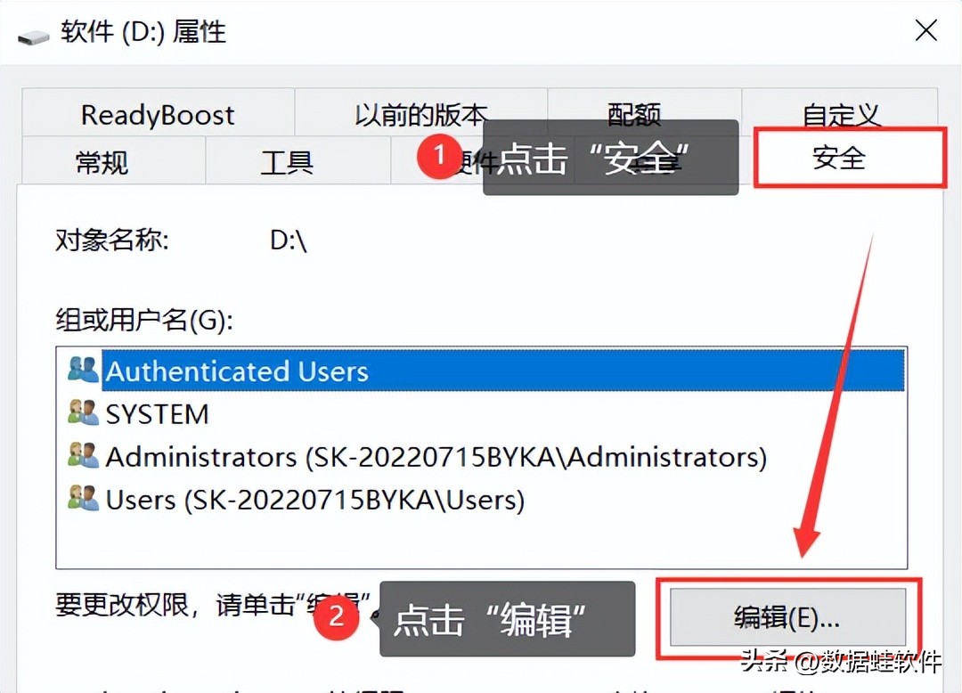 步骤2:在打开的窗口,切换到【安全】页面,再点击【编辑】;