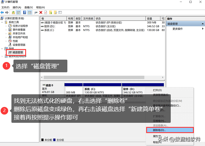 步骤2:在打开的窗口左侧,找到【磁盘管理】并单击它。之后在右侧找到你要格式化的磁盘,右键选择【删除卷】;