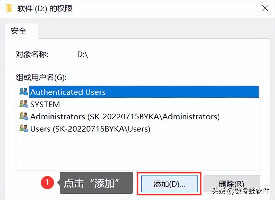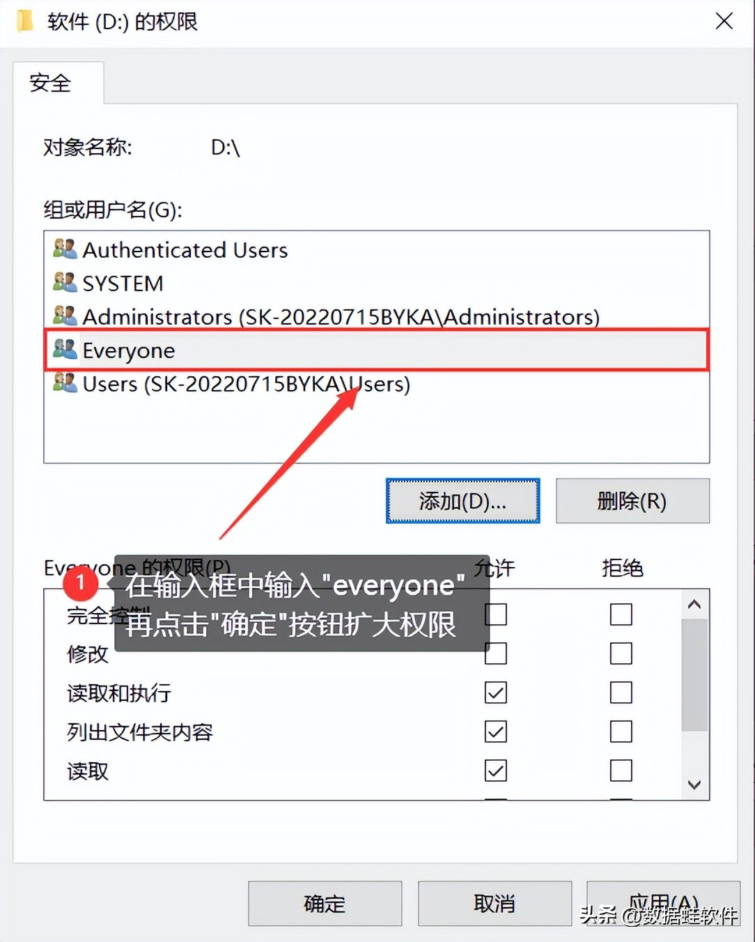 步骤4:在【添加】的页面输入【everyone】,单击【确定】来扩大权限,之后就可以格式化硬盘了。