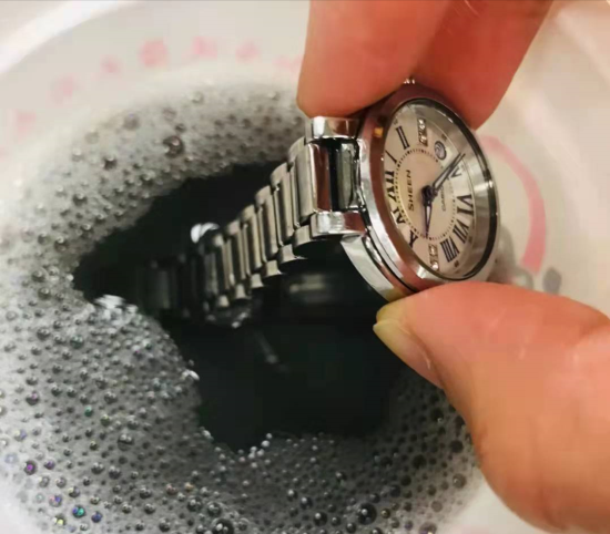 将手表链放进盐水中浸泡半天(注意手表要防水100米以上),你会发现,水中有一些黑色的污垢沉淀。然后用牙刷清洗手表。