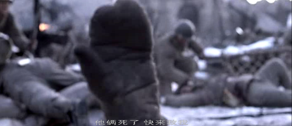 影片开始一段战争戏里有个细节,一个战士受伤躺倒在地,指着倒在身边的战友大声向担架呼救“他两死了,快来救我!”