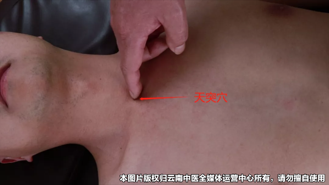 天突穴位于颈部,当前正中线上,两锁骨中间,胸骨上窝中央。轻轻地向下、向内按摩天突穴。先顺时针按10圈,然后交换逆时针按10圈。直到皮肤呈现微微发红的状态,呼吸就变得通畅了。