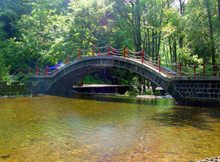 吊水壶风景区里的木板搭就的观光栈道蜿蜒曲折,人行谷底、但见青藤翠蔓、碧绿参天,如碧海泛舟。游人沿着峡谷中的溪流行进,走上一段路就要经过一座小桥,时而溪左,时而溪右。记者粗略的算了一下,大概得有十几座不同造型的小桥分布于十里绿色长廊之中。