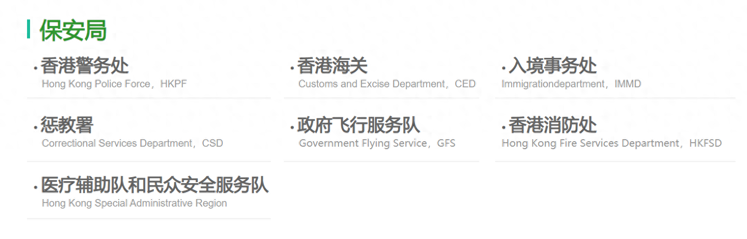 保安局辖下的部门有:香港警务处、香港海关、入境事务处、惩教署、政府飞行服务队、香港消防处、医疗辅助队和民众安全服务队,这些部门都是正规及辅助性的纪律部队。