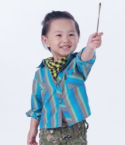 这位3岁小宝宝很有艺术家的气息呢,发型当然也要跟得上节奏呢,将头发整齐的梳到脑后,看起来更为的清爽呢,而不妨将长发在脑后扎成马尾,就更是摩登呢!