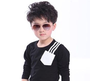 这位3岁的小男孩对于发型更倾向于侧分的短梳发呢,侧分的设计凸显出一张胖嘟嘟的小脸来,而左右的高低发分布更为的时尚呢,搭配上酷酷的太阳镜,更是潮流呢。
