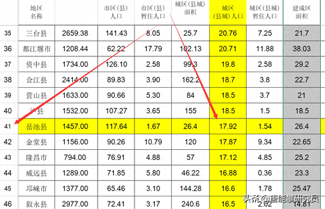 如果按照城区人口排序,岳池县城人口在四川147个市县中排在第41位。如果想粗略知道排除地级市之后的排名,减掉18就行了(四川有18市3州)。