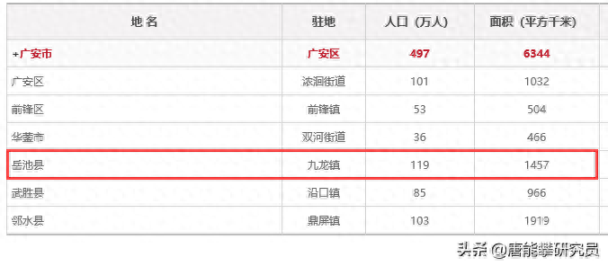 广安区县人口与面积表。