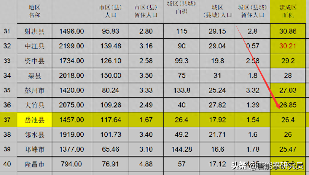 岳池县建成区面积约26平方公里,在全省排37名左右。