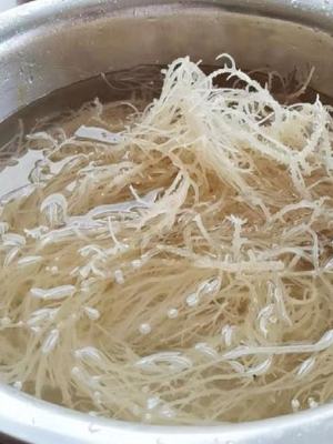 凉水要没过干龙须菜,泡发的时间大约15到30分钟淡干,如果不烂想吃脆脆的口感,泡发的时间要短一些,如果想吃比较软糯的口感,泡发的时间稍微长一些,这个可以根据个人的喜好来增减泡发的时间,泡发过程中也可以后能随时捞出好吃来尝一下,泡发后的龙须菜是透亮的白色或者是微微的黄白色,将泡发后的龙须菜清洗干净后捞出控水备用。