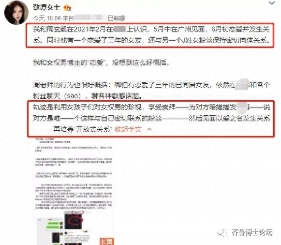 爆料的是一个叫“致谭女士”的账号,她说自己与周玄毅2月相识于网上,交流三个月后在广州见面,接着6月初确定恋爱关系。与此同时,周玄毅还有一个交往三年的女友,以及一个保持关系的女粉丝。