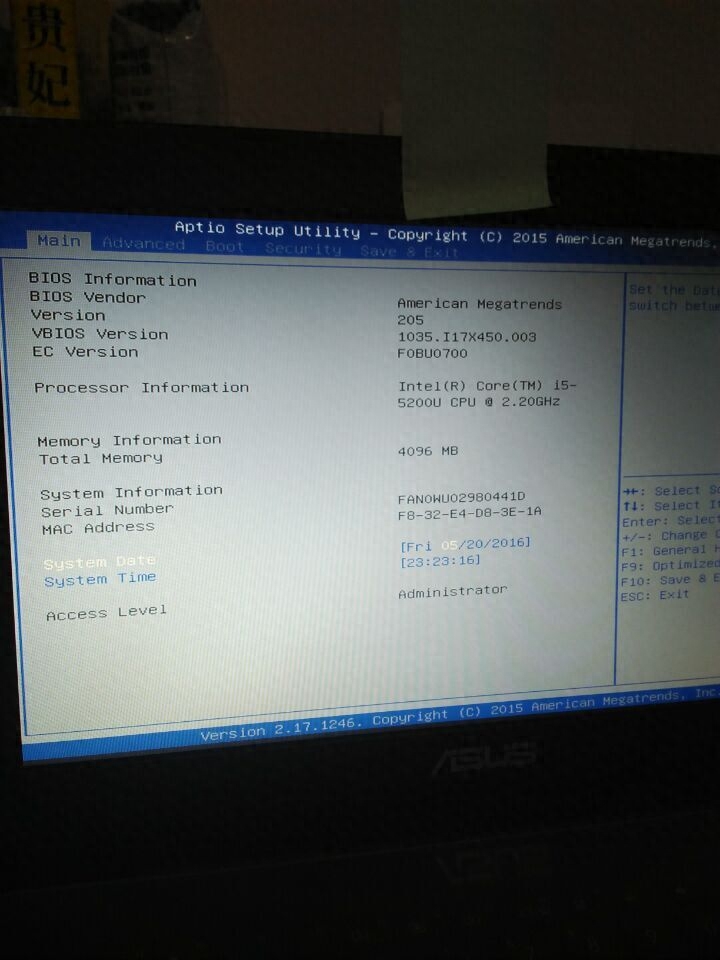 首先,要开机进入bios环境,一般电脑是按下F2(或者F12、DEL等等,不同机型不一样)。我今天的系统重装环境是华硕w419L,此款机子的进入bios方法是开机长按F2。进入bios之后是酱紫的。