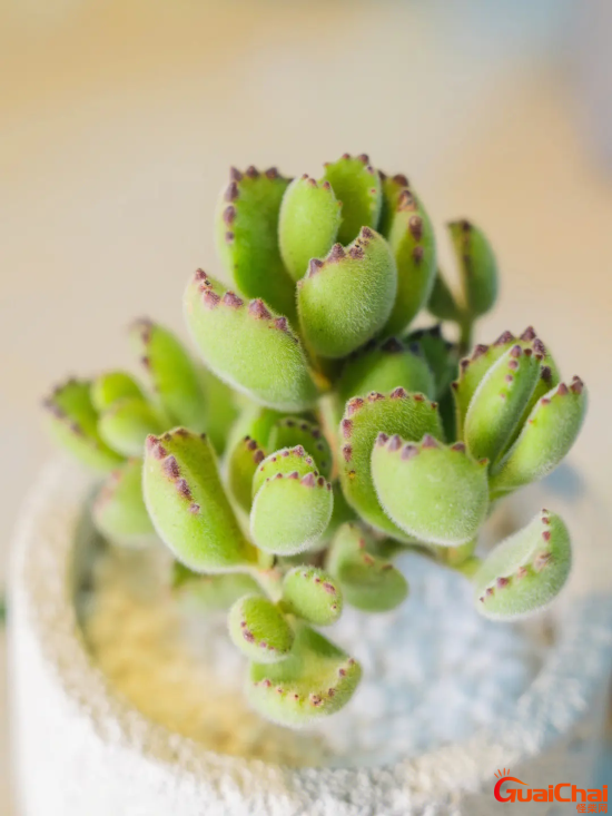 熊童子的需水量不多,即使是在长势旺的时候,浇水也不用太频繁,平时土壤保持在稍微干燥一些的状态比较好,如果它的生长环境非常潮湿,还需控水并加强通风,另外,冬天也要控水。