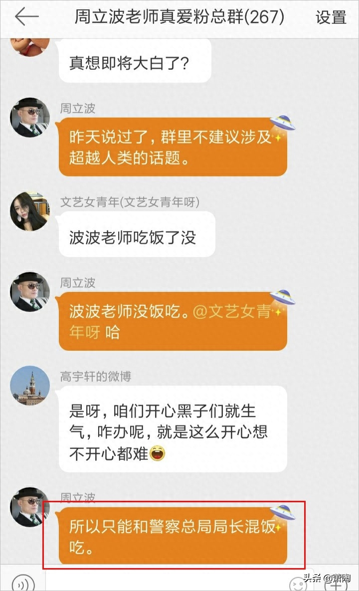 对于萧陶,周立波是恶语相加;对于粉丝,他则是想挽回面子,只是做法稍显夸张。3月14日,在其真爱粉总群里,他先用调侃的口吻说“笑死我了!发了张假的,跳出来一群假的!哈哈”,然后又假模假式地说“我发了一张假局长的合影,结果真假局长的家属全跳出来了!要的就是这个节奏啊”。如果当初真的是开玩笑的话,那么他应该在被别人戳穿之前主动承认,而不是事后再找补。再说,这哪是什么找补,而是越描越黑,连带节奏这种事他都承认了。