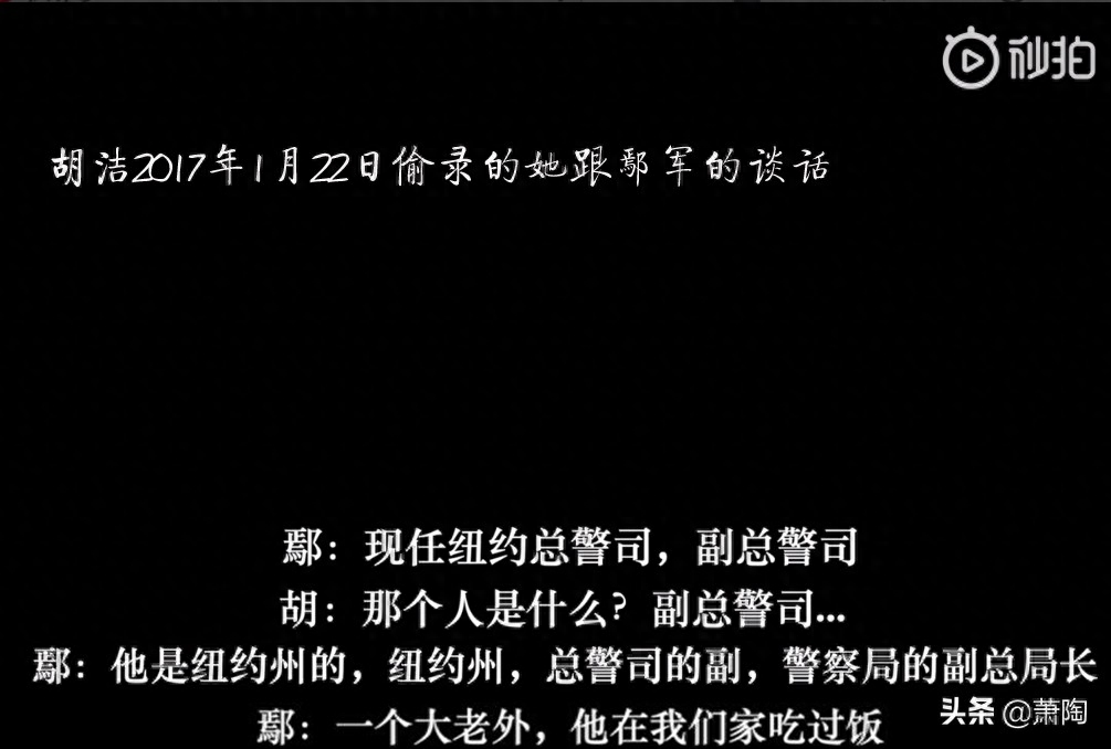 为了求证,萧陶找出周立波发的那段录音。这是胡洁于2017年1月22日偷录的她跟鄢军的谈话。鄢军告诉胡洁,警察局的副总局长在他家吃过饭。但这位是纽约州警察局的副总局长,而周立波说的是纽约警察总局局长,指的应该是纽约市警察局。虽然介绍人相同,但这两位局长不是一个单位的,应该不是同一个人。