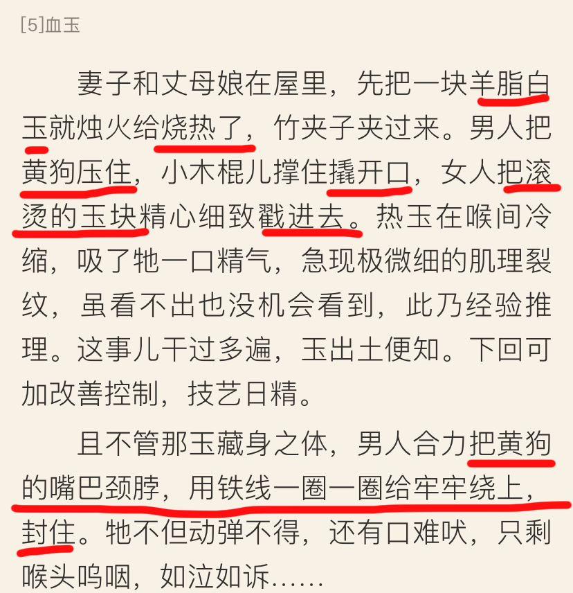 简单点说,就是将玉石用火烧热之后,用木夹小心翼翼地放到狗的喉咙当中,这时候狗一定会被烫得满地打滚,人们就用铁丝将狗的喉咙和嘴巴死死地缠住,防止玉石从喉咙中滑落,然后趁着狗还没死,立马将其活埋,几十年以后再把玉取出,这时候就得到了血玉。