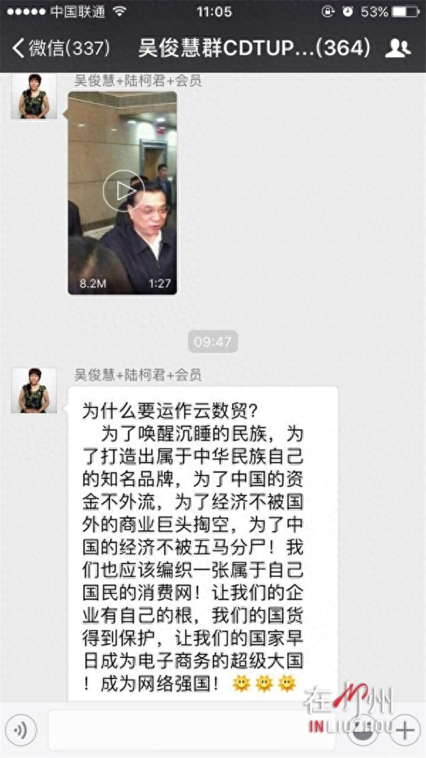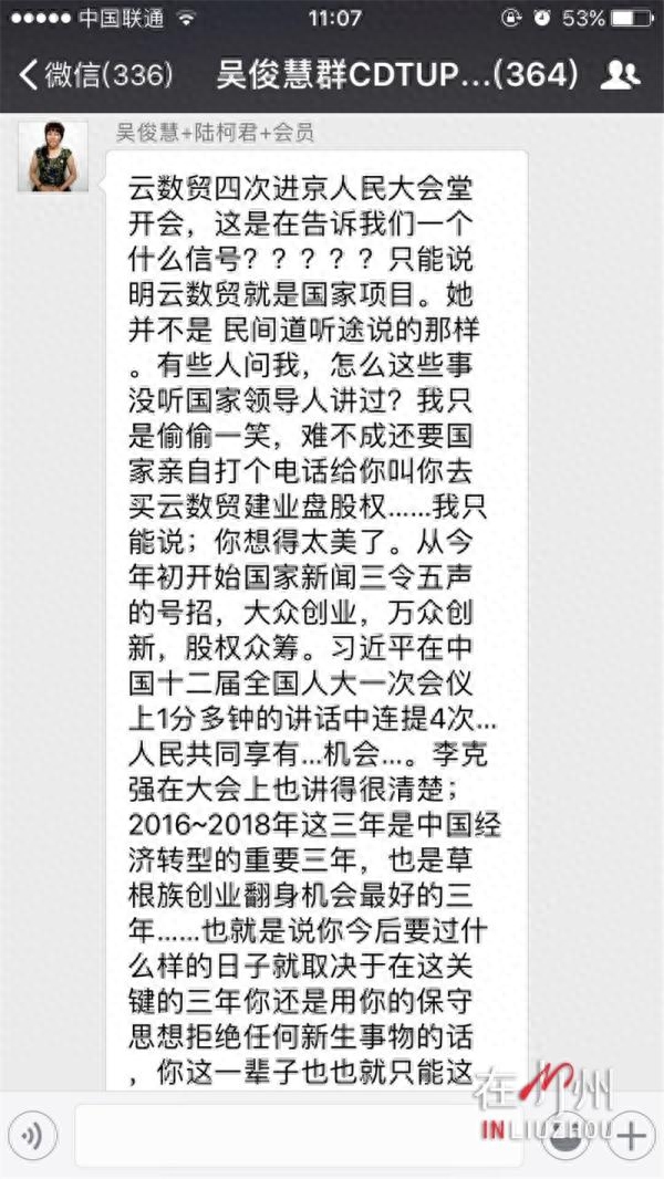 黄先生经母亲介绍,进入到了“金光财富”负责人吴某某建的微信群,想进行进一步的了解。黄先生说,经过推荐才能进群,进群后就要交钱了,现在他的母亲也没打算把钱退出来。他说,经他了解,他母亲所购买的,是中国云商国际建业联盟集团股份有限公司的“原始股”,用他们的行话,叫作“云数贸建业盘”。