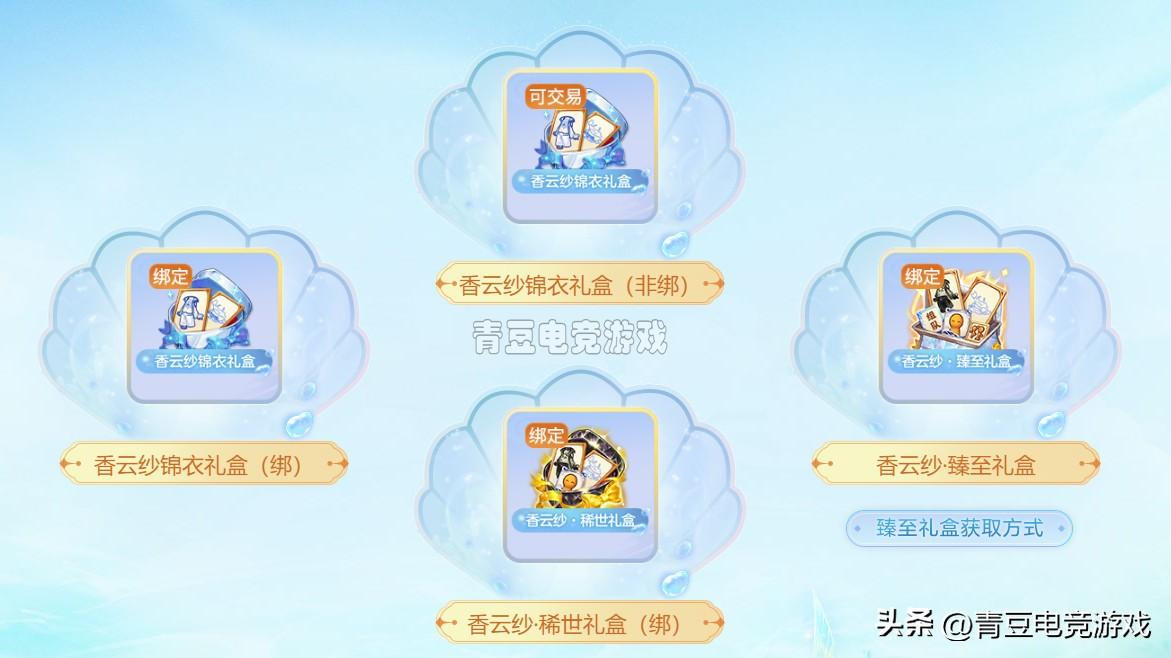 锦衣礼盒一共分4种礼盒:香云纱锦衣礼盒(绑定)、香云纱锦衣礼盒(可交易)、香云纱臻至礼盒(不可交易)、香云纱稀世礼盒(绑定)这么四种。