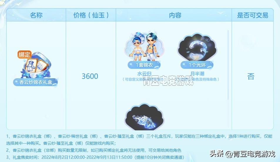 香云纱锦衣礼盒(绑定)3600仙玉,其中包括水云归锦衣一套、月半潮光环一个,风卷浪足迹一个,总体来说还算可以。