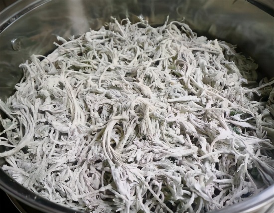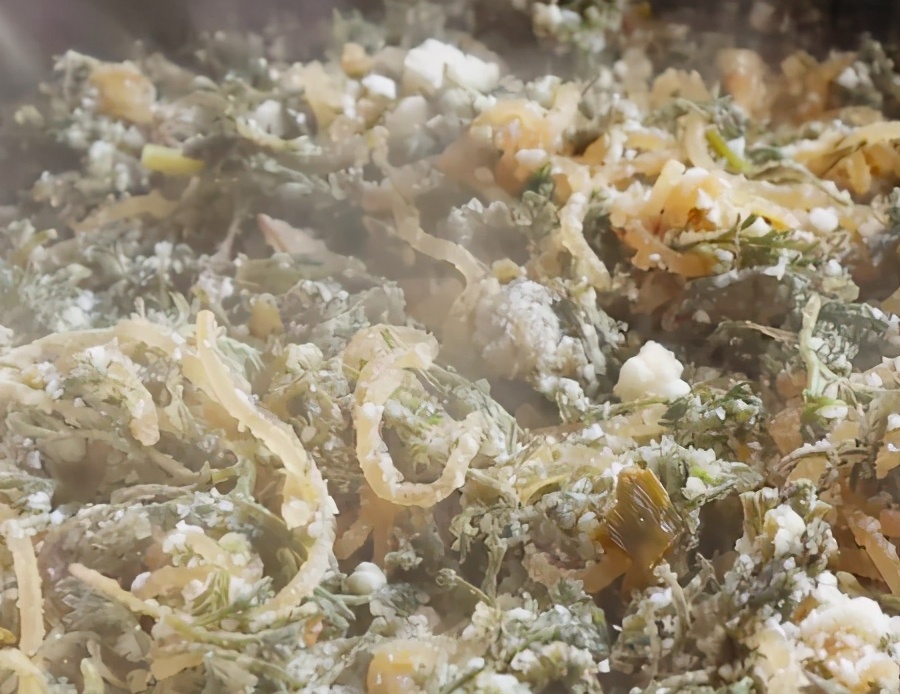 第四步:白蒿和粉丝搅拌好之后,再少量多次的加入面粉,边加入边搅拌,等到粉条和白蒿上面都裹上面粉就可以了。接着在蒸屉中放入一块白布,把搅拌好的白蒿粉条倒进蒸屉中,用手把它们均匀地摊开,然后把锅盖盖上,开大火开始蒸,等到锅中的水烧开之后开始计时,蒸8-10分钟即可出锅。