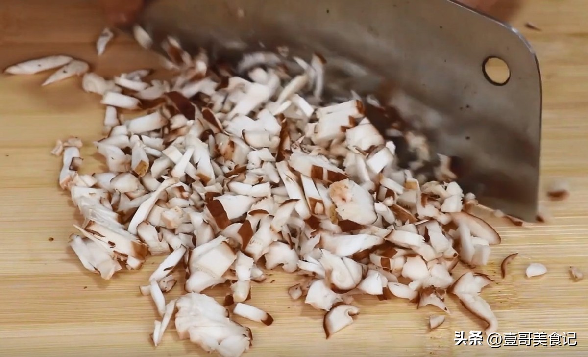 2.准备几个香菇,放进盆子里,再倒进去适量的清水,用手将香菇搓洗干净。洗净之后,将香菇捞出来放在大碗里控水。接着,将香菇放在案板上,先用菜刀将它们的根部全部切掉,再把菌盖的部分切成条,最后剁成碎丁。将香菇丁装进大碗中待用。