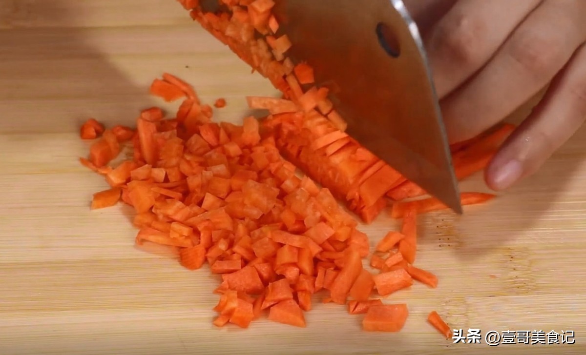 4.取出一根胡萝卜,先用清水将它表面的泥土清洗干净,再取出来控一下水。然后,把胡萝卜的外皮削掉,再把它的两头给切掉不要,接着,就把它先切成片,再切成细丝,最后切成胡萝卜丁,放入大碗中,和香菇丁一起待用。