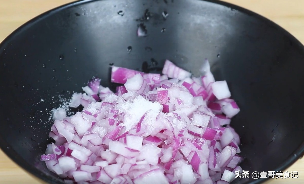 3.这时候洋葱也泡好了,将洋葱从水中捞出来控一下,然后放在案板上。将洋葱横着放在案板上,用菜刀切下去,就能把洋葱切成碎丁了。这样切洋葱丁非常的方便。切完之后,将洋葱丁放进碗中,加入一些食盐搅拌均匀后,腌制5分钟。