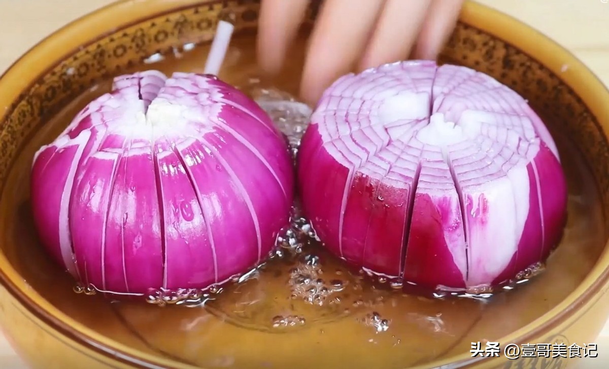 1.首先,准备两个洋葱,将它们放在案板上,用菜刀在上面切开,切成像花一样,但是不要切断。接着,把切好的洋葱放在大碗里,给洋葱上面撒上一些食盐,再取出清水,从洋葱上面浇下去,用食盐水来浸泡洋葱。