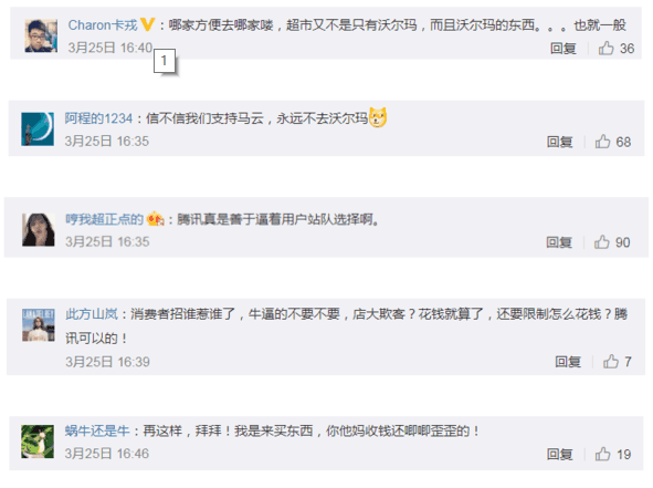 此后,多地消费者反映称,自己所在城市的沃尔玛相继宣称暂停使用支付宝,有的以“系统升级”为由,有的以“合作暂停”为由,并表示恢复时间未知,虽然并没有张贴出禁用支付宝的公告, 没有告知恢复使用支付宝付款的时间日期,这也不禁让人想起2011年腾讯大战360的往事,两家大型公司互相排斥对方,强行要求用户卸载对方软件,使整个中文网络世界带和广大网民来严重困扰。也是从那次事件,腾讯开始反思自己的商业逻辑和理念,作出开放生态,拥抱移动互联网的决定。尽管腾讯与阿里各有体系是事实,但不等于说互不通用是正确的。虽然像是在商业竞争环境下的一个不得已选择,是一个悬而未决的问题,并不意味着这种模式可以复制到双方旗下的阵营,扩散到整个商业生态,其后果可想而知。