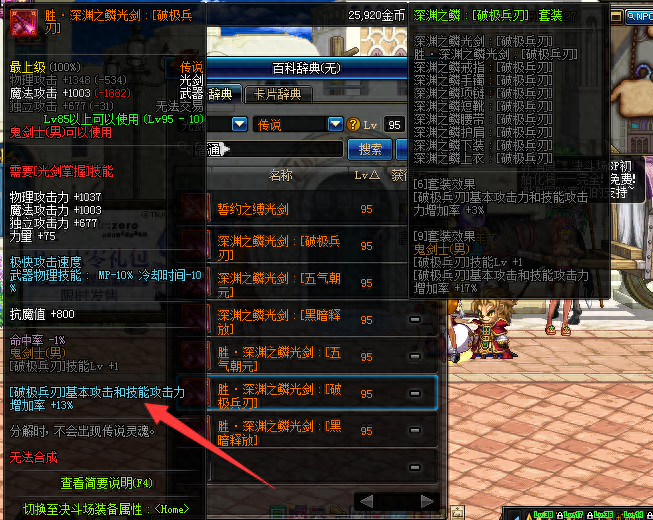 原来版本剑魂的毕业换装是在MR.根之源9+远古遗愿的情况下把破极兵刃堆到20级,这样BUFF的提升率能达到66.2%。不过大家要注意远古遗愿这把武器的提升率,虽然装备上写着的是破极兵刃的提升率上升20%,但是这个20%不是加算的而是乘算的,也就是说只计算远古遗愿这条属性的提升的话,原来提升50%的BUFF会变成60%而不是70%。