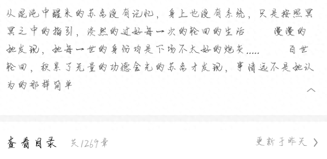 书评:没有系统,女主每一世进入小世界帮助委托人完成心愿获得功德,虽然没有完结,但是已经连载一千多章,已然“肥美可食用”。女主强大,不停虐渣,绝不手软,而且有自己的想法,无cp。