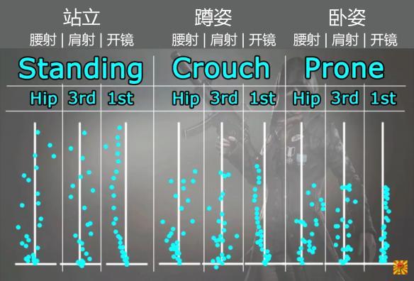 从上图我们可以看出,弹道分布效果:卧姿>蹲姿>站姿。也就是说卧姿(趴着)后坐力最小,子弹散步最好,从而提高命中率。
