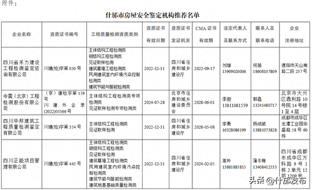 按照省政府办公厅印发《全省自建房安全专项整治实施方案》(川办发〔2022〕51 号)要求,为保障自建房安全排查整治工作,规范鉴定机构及其从业人员的行为,确保鉴定质量和水平,我局对在我市或拟在我市从事房屋安全鉴定机构的单位资质、人员配置等情况进行了核实,现公布“什邡市房屋安全鉴定机构推荐名单”(见附件)。房屋产权人(使用人)可在该名录库中自行委托,也可自愿选择其他符合资质条件的房屋安全鉴定机构签订鉴定合同,开展房屋安全鉴定工作,并承担鉴定费用。