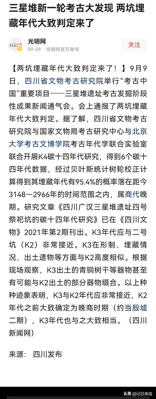 光明网官方发布消息,K2、K3掩埋年代非常接近。