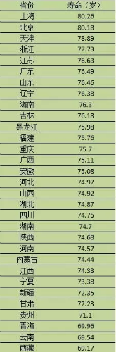 第六次全国人口普查结果显示,2010年全国人均预期寿命为74.9岁。分省来看,人均预期寿命有所差异:北京、上海两市均已超过80岁,预期超过70岁的有26省(市、区),青海、云南、西藏三地预期寿命处于68至70岁区间。虽然上海、北京污染严重雾霾高发,青海、云南、西藏空气环境质量优秀——PM2.5值小于京沪,水质状况优于京沪,但前者的人均预期寿命比后者长逾10岁。