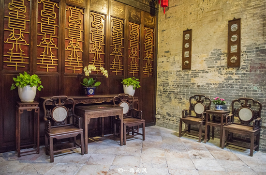 卢家大屋并不在城区的主要干道上,而是位于相对偏僻的大堂巷,这座大宅建成于1889年,已经有一百多年的历史,是商人卢华绍的住宅,厚青砖是主要建造材料,室内的木质家私用料考究,雕刻精细,厅堂布置简约而不失典雅,足见主人有较高的审美情趣。