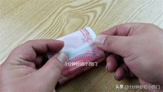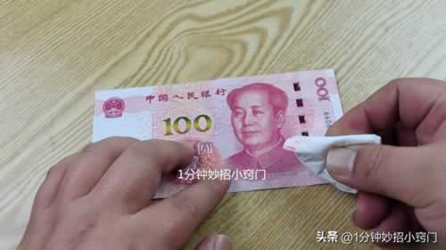 首先,第一点,我们可以在手上沾上一滴水,把水滴滴在钞票左下角的位置,涂抹一下,这样我们就能够清楚地看到,上面有100的字样,这个100的字样也是非常明显的,滴水的作用,就是为了让这个100字样,更加明显地展示出来。